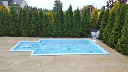 Piscina compacta y elegante de 4,5 metros de largo con escalones laterales funcionales. Esta piscina está diseñada para ofrecer la máxima comodidad y estética, ideal para jardines y espacios recreativos más pequeños.